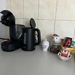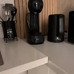 このアパートには設備の整った台所が備わっています。 くつろげる場所としてテラスもあります。